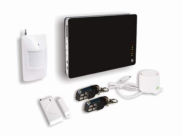 L’impianto tipico wireless è composto da una centralina d’allarme, dalla tastiera, da un ricevitore bicanale radio, dalla sirena interna, dalla sirena esterna radio, dai volumetrici interni radio e dai contatti magnetici e inerziali radio.